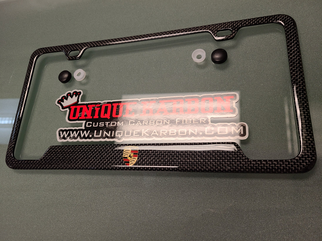 Porsche crest is featured on our exclusive handmade in house carbon fiber plate frame. Made in plain weave to match oem porsche carbon fiber. 50 state legal (Registration Notches)